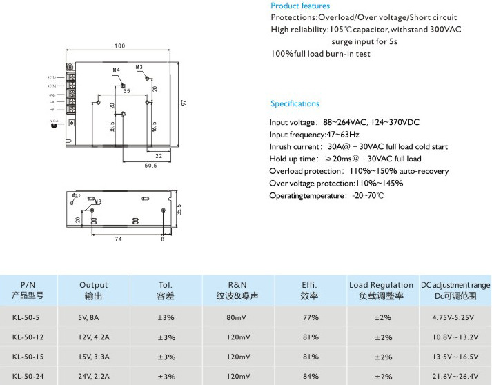 高可靠性:105C長壽命電容,能承受300VAC輸入電壓5秒不損壞
